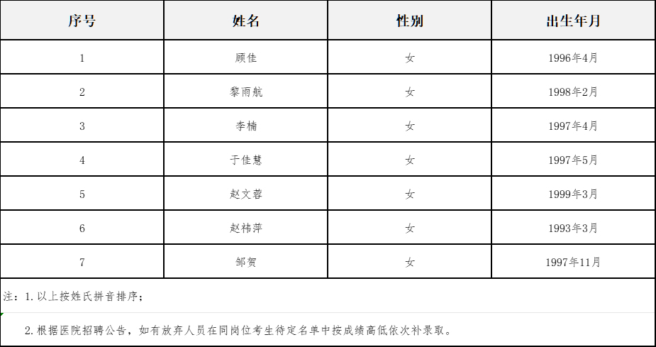 根据我院2024年3月20日发布的《吉林省一汽总医院面向2024年高校应届毕业生开展公开招聘编外聘用人员公告》, 在个人现场报名及资格初审、半结构化面试、体检及资格复审等环节的基础上,现将顾佳等七名同志作为我院面向2024年高校应届毕业生公开招聘编外聘用人员拟录用人选,公示如下: