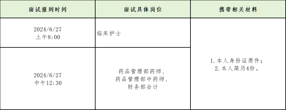 根据我院2024年6月17日发布的《吉林省一汽总医院招聘编外聘用人员公告》, 经个人现场报名及资格初审环节,现将部分岗位第一轮面试通知如下: