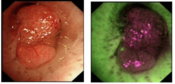 (左侧为传统白光支气管镜图像,右侧为荧光支气管镜图像)