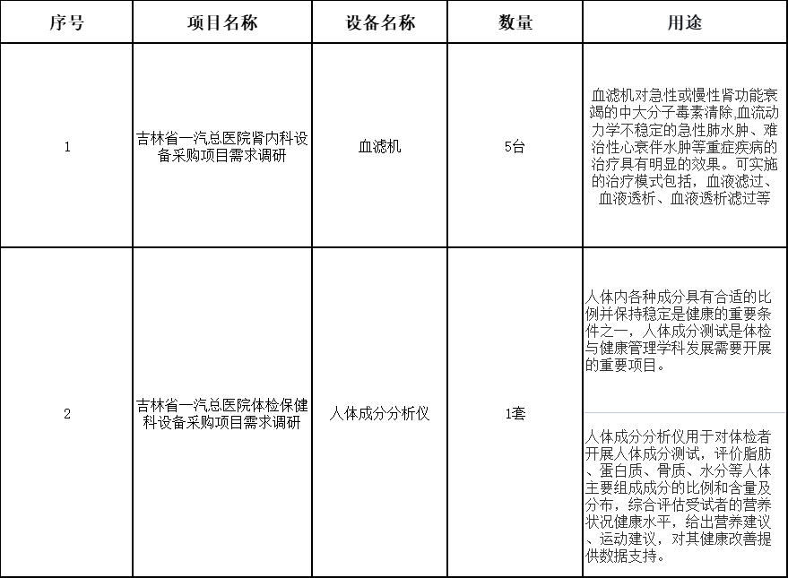 吉林省一汽总医院肾内科、体检保健科设备采购项目需求调研