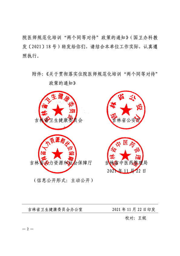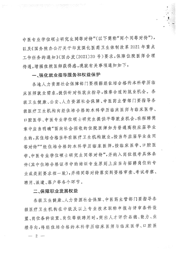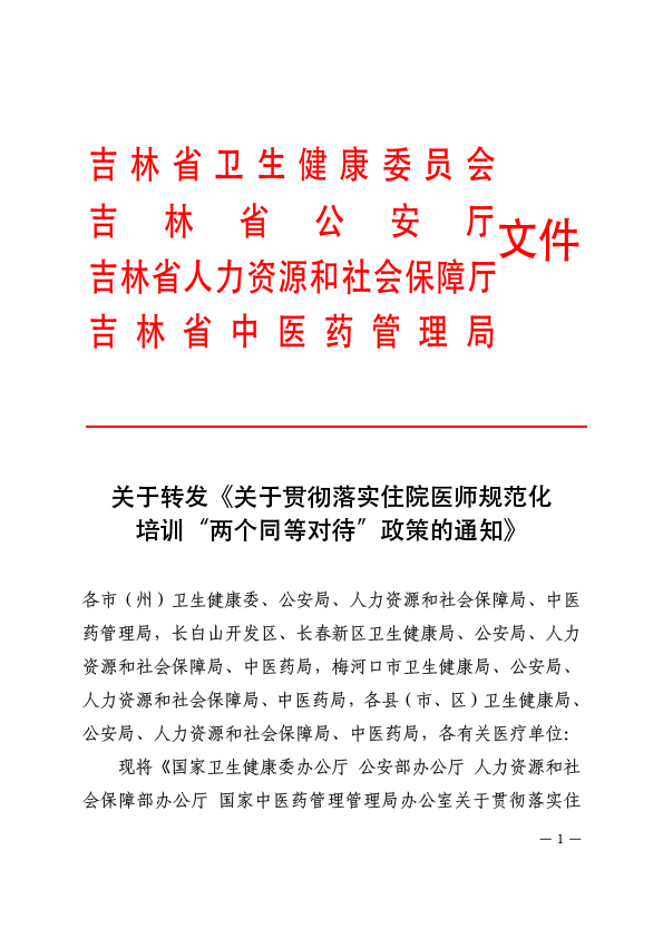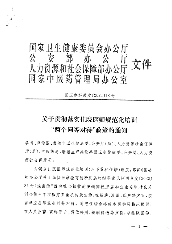 关于转发《关于贯彻落实住院医师规范化 培训“两个同等对待”政策的通知》