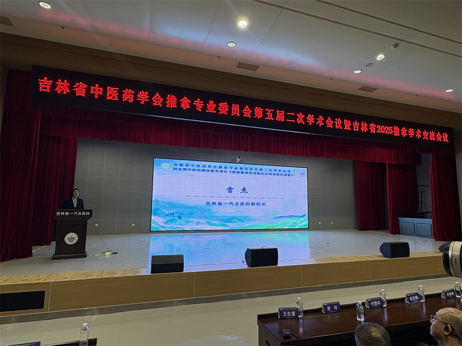 10月11日,吉林省中医药学会推拿专业委员会五届二次学术会议暨吉林省2025推拿学术交流会议及国家级继续教育项目《脏腑推拿技术临床应用高级培训班》在我院医疗综合楼报告厅隆重召开。长春中医药大学副校长杨永刚、吉林省中医药学会秘书长李静静出席会议并讲话,长春中医药大学附属医院副院长陈华、吉林省一汽总医院纪委书记(主持全面工作)肖东辉、副院长雷杰、孙刚出席会议。长春中医药大学附属医院推拿科主任吴兴全主持会议。国内知名专家学者100余人参会。在开幕式上,我院副院长雷杰代表我院发表致辞。首先她对莅临本次盛会的参会领导及与会代表表示热烈欢迎,并介绍了医院的发展历史与学科建设情况。她表示:“推拿作为中医药领域的重要组成部分,在我国有着悠久的历史和深厚的文化底蕴。吉林省一汽总医院也始终秉持‘中西医并重、协同发展’的理念,将推拿学科建设作为提升医疗服务能力的重要抓手。未来,我院将以本次会议为契机,进一步加强与省内外同行的学术交流,希望各位代表以会议为纽带,实现“智慧交汇、经验共享、友谊深化”,在交流中启迪思维、研讨中凝聚共识、合作中推动实践,共同谱写吉林省推拿事业高质量发展新篇章。”