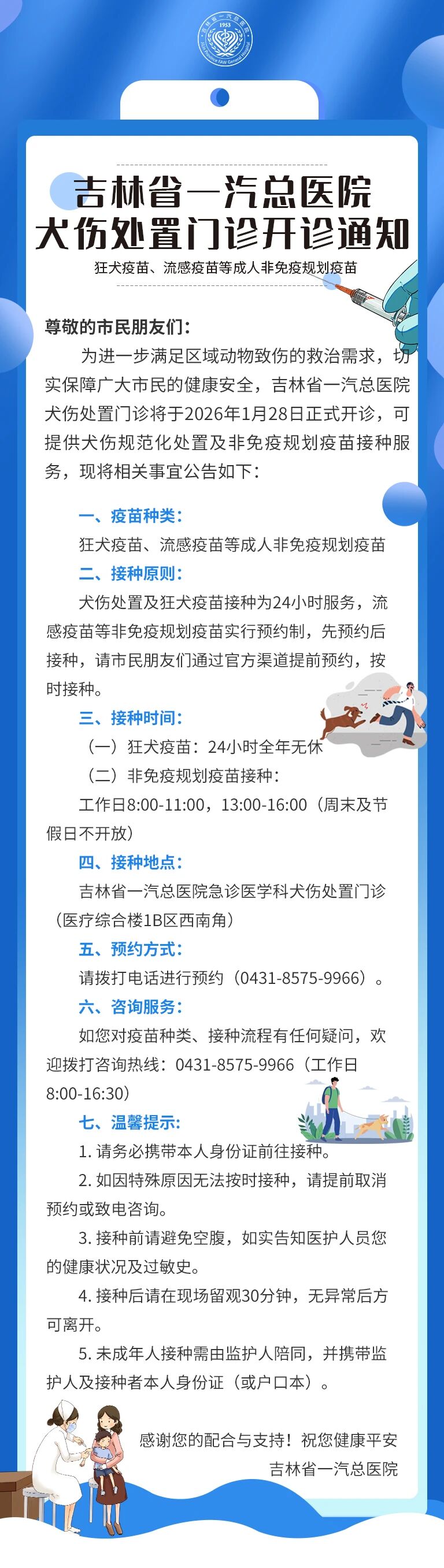 吉林省一汽总医院犬伤处置门诊开诊通知