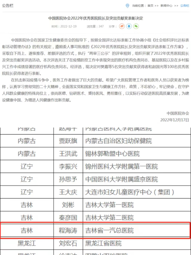 根据中国医院协会2022年优秀医院院长及突出贡献奖评选表彰方案,经评审委员会评选,中国医院协会2022年优秀医院院长及突出贡献奖受奖人已经产生,吉林省一汽总医院党委副书记、院长程海涛荣获“中国医院协会2022年优秀医院院长”荣誉称号。“优秀医院院长”评比表彰活动是经国家卫生健康委批准的中国医院行业最高的管理类奖项之一。