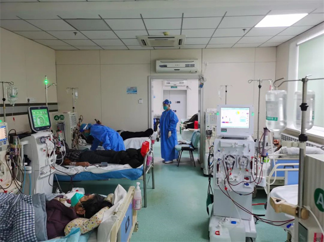 疫情发生三年来,医院血液净化中心由于其特殊性,始终坚持患者生命至上,从未按下暂停键。近期,血液净化中心的日常工作更是面临巨大挑战。大多数医护人员病倒后经过短暂的休息,便积极请战要求返岗工作,以保障每日150多名门诊患者的透析治疗不被中断。他们每天三班倒,白天为阴性患者透析结束后,对室内进行严格消杀,再为阳性患者治疗,随后还要再消杀,每天结束工作已是深夜,由于每日工作时间长,为保障次日的正常工作,许多工作人员都长期闭环居住住在科室。正是他们的默默坚守,才换来了肾病患者正常健康生活。